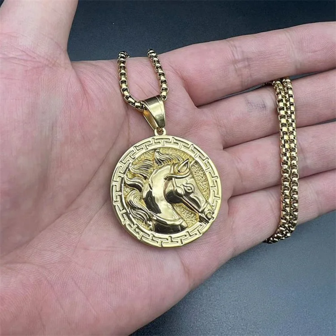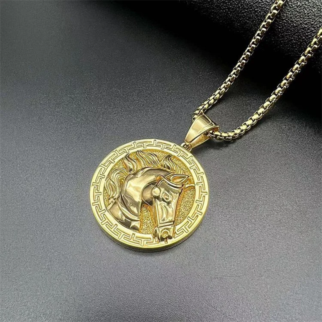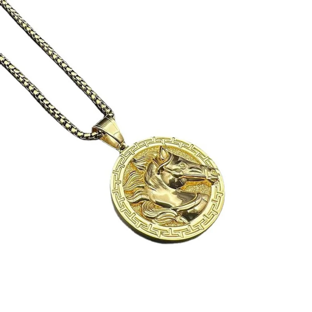 Gold pendant necklace featuring a detailed horse head framed by a Greek key border—crafted for elegance, strength, and timeless style.
