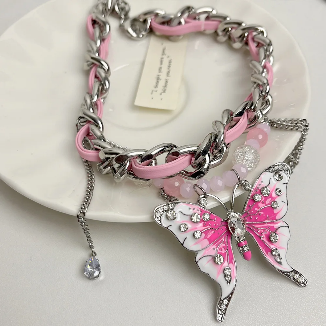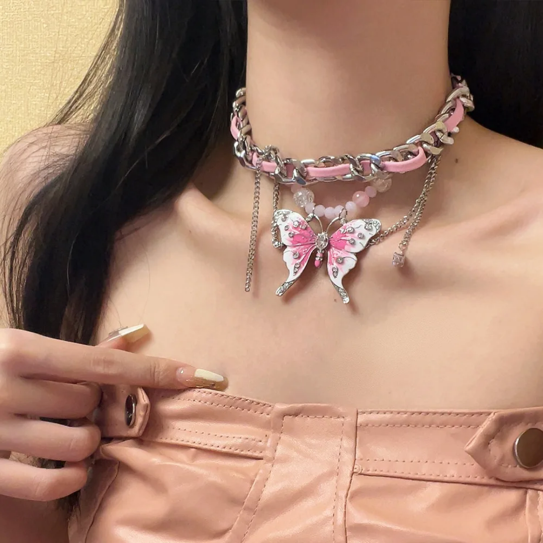 Statement choker necklace with pink woven chain and butterfly pendant—playful, bold, and crafted for standout feminine style.