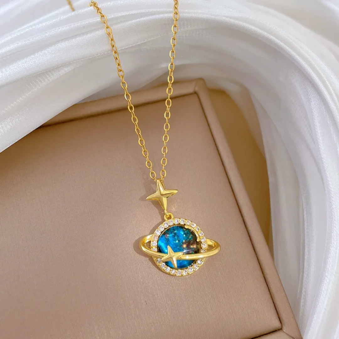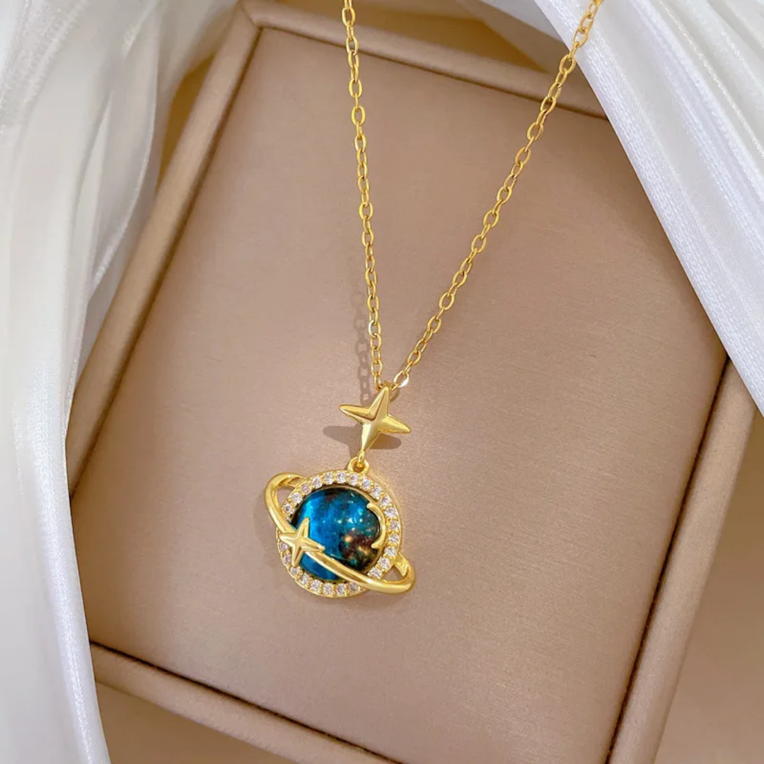 Planet-inspired pendant necklace featuring a deep blue center, crystal halo, and gold star accent—crafted for cosmic elegance and standout style.
