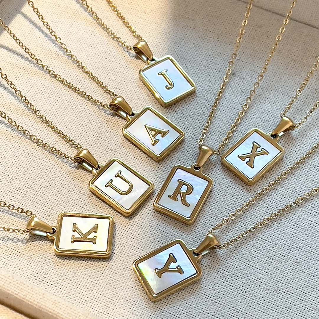 Gold initial pendant necklace with white enamel detailing—a sleek, personal accessory available in multiple letters.
